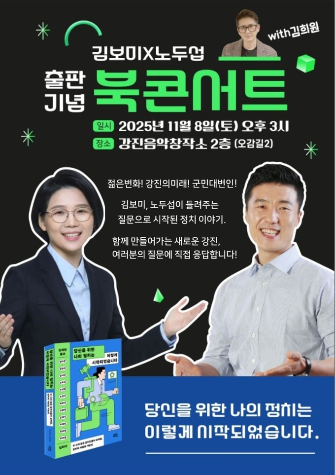 오는 11월 8일(토) 오후 3시, 전남 강진음악창작소 2층(강진읍 오감길 2) 에서 김보미 × 노두섭 의원이 함께, 가장 먼저 출판 기념 북 콘서트를 진행합니다.