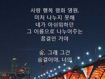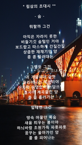 예컨대 중요한 건 주제다. 숨, 숨결.... 그래, 그걸 느끼고 싶었던 건가 보다. 누군가의 숨결을 그리워하면서, 그 숨결에 위로를 받고, 힘을 얻고, 새 희망을 싹틔우고, 그리고는 삶의 활력소로 삼고 싶은 바램, 그거였다. 마치 사막의 오아시스처럼, 깊은 산 속 옹달샘처럼, 한 모금만으로도 세상 어떤 것과도 바꿀 수 없는 소중한 생명수같은 무엇, 그게 이 시를 통해서 적어보고자 했던 염원이며 시도였던 거다. 그래서 나름 귀히 여기고픈 욕심은 있었기에 버리지 않고 묻어두었던 작은 자산이다. 오늘에서야 비로소 다시금 빛을 받게 된 스토리로...